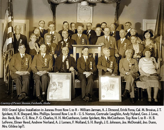 As early as the winter of 1902 and 1903, a group of men in Nome got together and outlined this idea for an Alaskan Order. These discussions resulted in a meeting of 28 men on February 7, 1907 in the office of Dr. Will Chase and Dr. Southward in the Nome Bank Building and a temporary organization was formed. A committee was appointed to draft a Constitution and By-Laws and report back to a meeting to be held on February 14, 1907. At that meeting a permanent organization was formed and the name Pioneers of Alaska was adopted and Igloos were given the name for local organizations. Nome became Igloo No. 1.